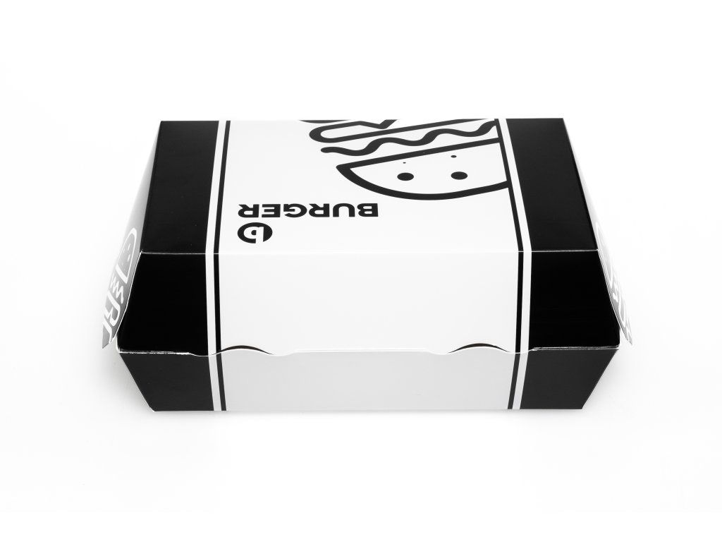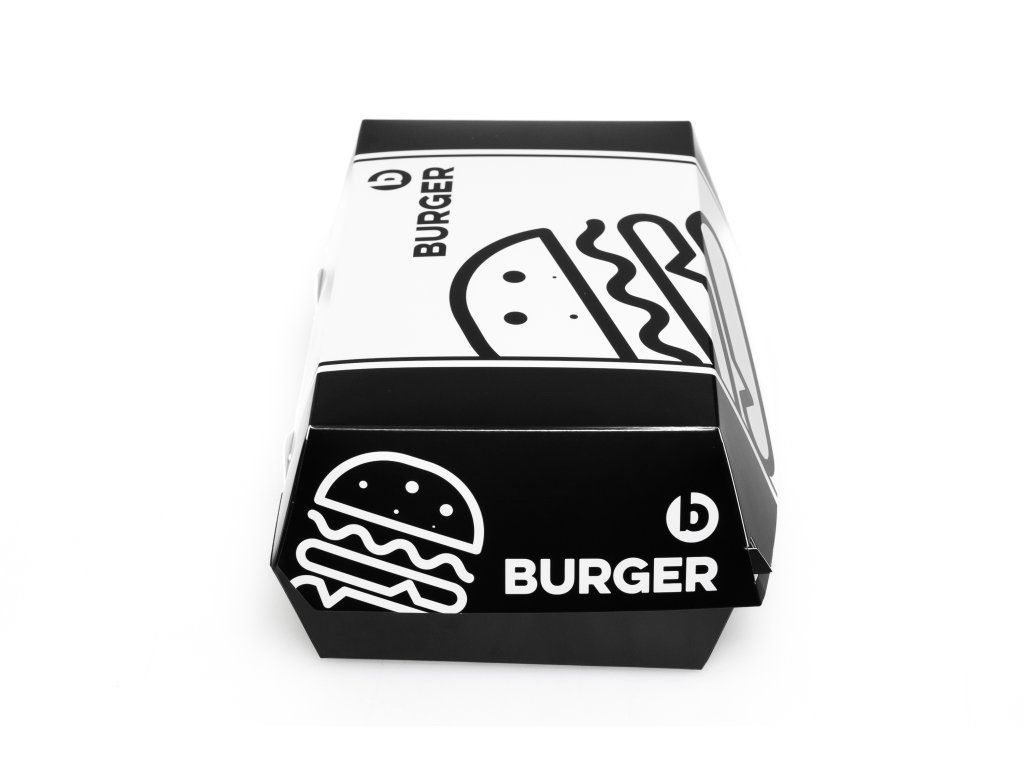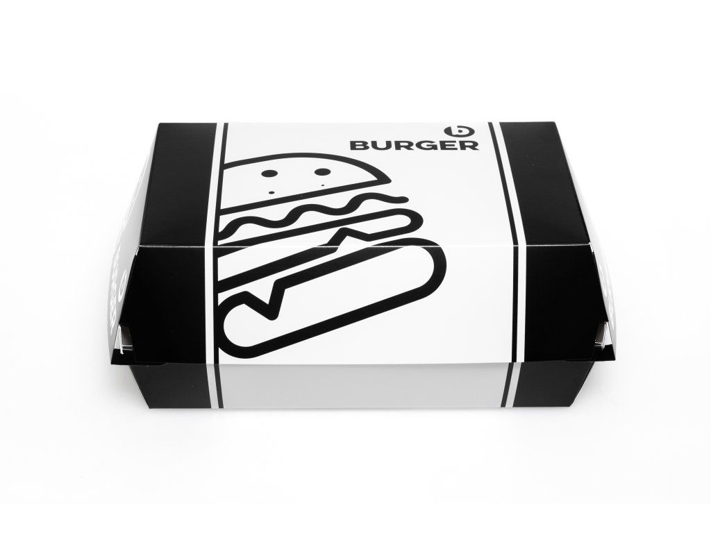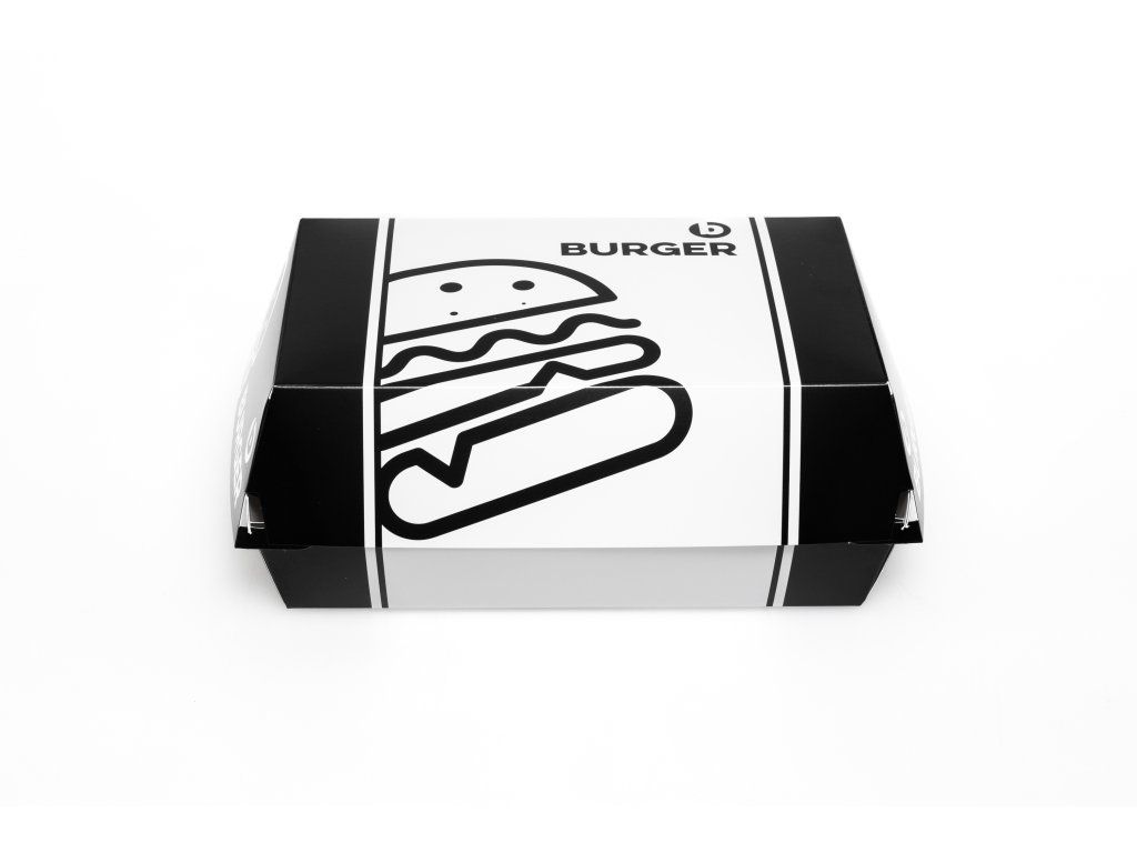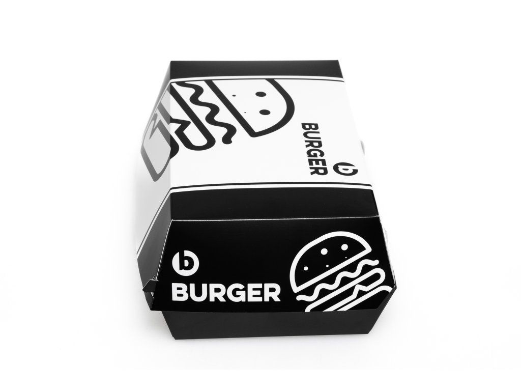 Rozmer obalu je ideálny pre maxi burgre, dvojité porcie alebo burgre s prílohami. Elegantná biela potlač pôsobí čisto a profesionálne, čo zvyšuje atraktivitu servírovaného jedla. Obal je praktický, jednoducho skladateľný a vhodný pre rozvoz, osobný odber aj food trucky.