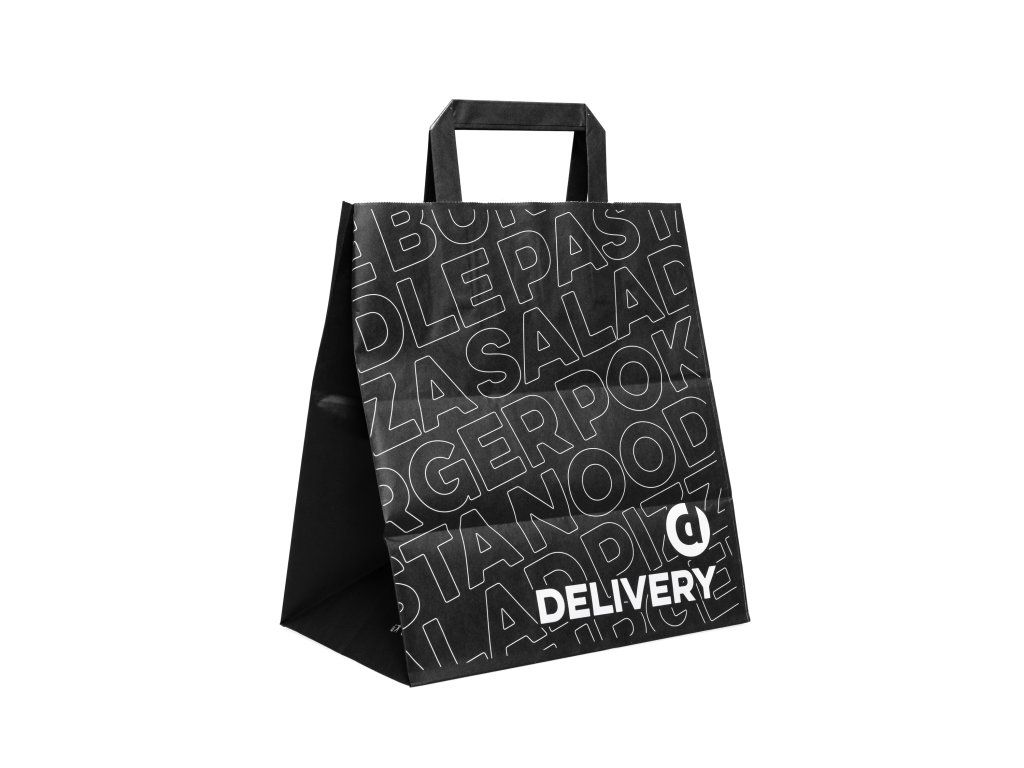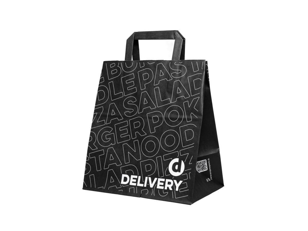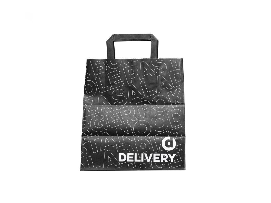 Elegantná čierna potlač dodáva taške moderný a profesionálny vzhľad, ktorý zvyšuje atraktivitu objednávky. Taška je praktická, ľahko skladateľná a vhodná pre rozvoz, osobný odber aj catering, pričom predstavuje ekologickejšiu a štýlovú alternatívu k bežným jednorazovým taškám.