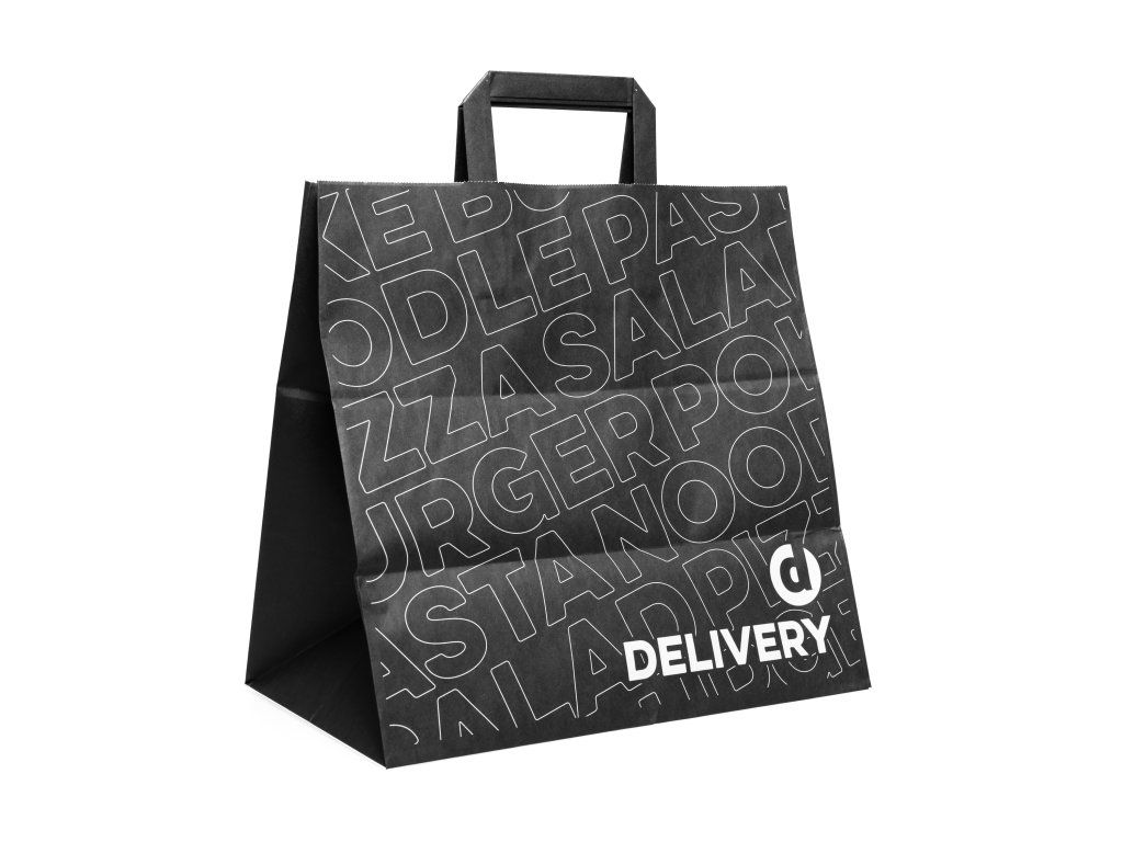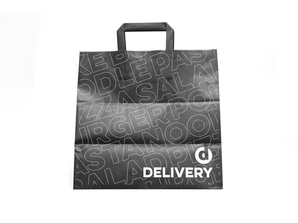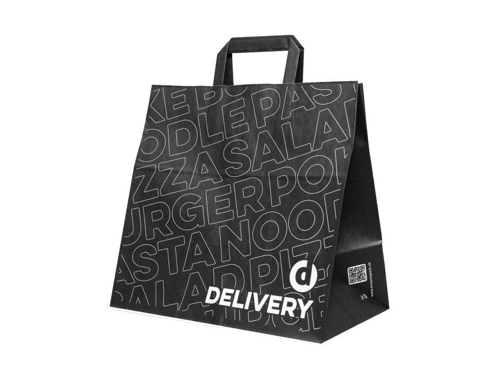 Taška veľká objem GSM 90 g/m² Print Black je ideálna pre bistrá, reštaurácie, cateringové služby a donášky. Vyrobená z pevného materiálu s gramážou 90 g/m², ktorý zaisťuje stabilitu a odolnosť pri prenose väčších jedál alebo balíčkov.